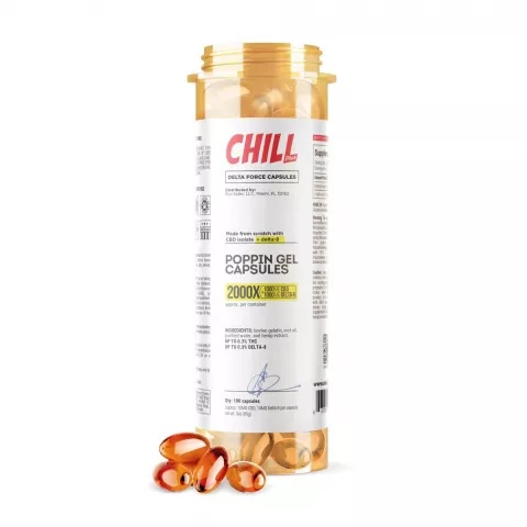 Experience a buzz that really pops. Chill Plus Delta Force Poppin Gel Capsules with Delta-8 THC will have you poppin’. It falls into a regulatory grey area, so until the government decides to ban it, it’s totally legal (for now). So you’ll want to pop some Delta-8 THC gel capsules before it’s too late!