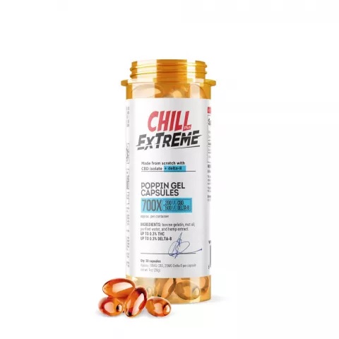 Chill Plus Extreme Poppin Gel Capsules have 200mg of CBD and 500mg of Delta-8 THC. The two cannabinoids work synergistically to balance each other out, creating a long-lasting buzz that keeps going until the sun comes up. One Delta-8 THC poppin capsule will make everything smooth. Take two, and your night will really pop! But remember, Chill Plus Extreme Poppin Gel Capsules in 700X pack a powerful punch, so take as directed.